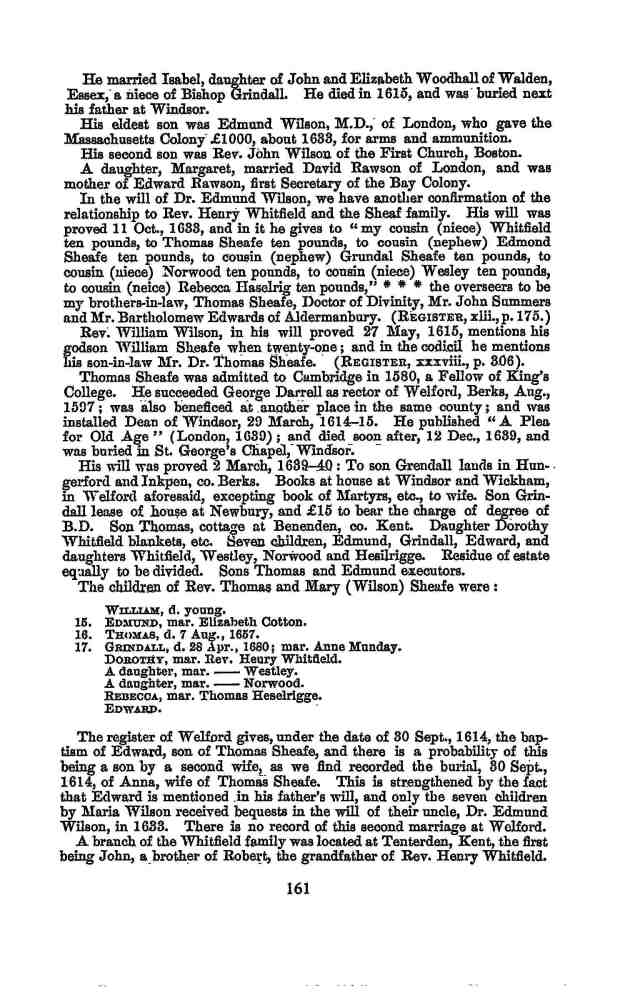“Later in the autumn of 1650, he went home, published the two following years. relattions of the spread of the gospel among our aborig. and died in the city of Winchester, it is said, in the office of minister though. of this I much doubt, if my construct. of the language of letters from his son-in-law and nephew. both named (5011ii[1]) John Higginson, as to his long life, be correct. See 3 Mass. Hist. Coll. VII. 200, 1 and 4. Commonly it is said he had ten children but I know only of (2515) Abigail, the first wife of (2514) Rev. James Fitch, and (5011ii) Sarah, wh. m. Rev. John Higginson.