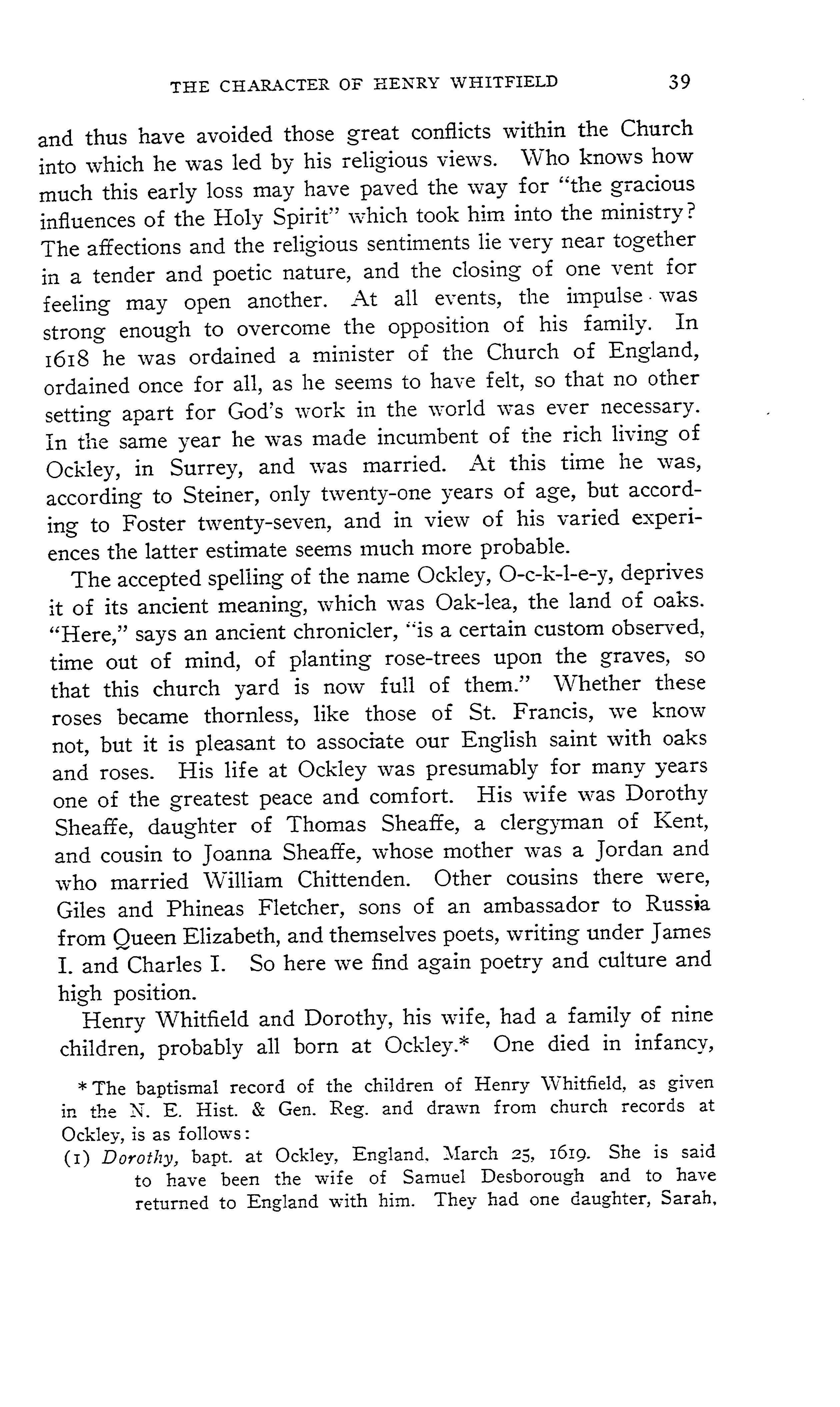 According to Cotton Mather, Henry Whitfield became a Christian in early life and was ordained to be a preacher. He entered the Christian ministry in the Church of England in 1618 (1616 according to Foster’s Alumni Qxonienses.) and enjoyed “the rich living of Ockley” in the county of Surrey, in the diocese of Winchester. He married Dorothy Sheaffer, daughter of a Kentish clergyman, and settled into the quiet, gracious life of an English Vicar.