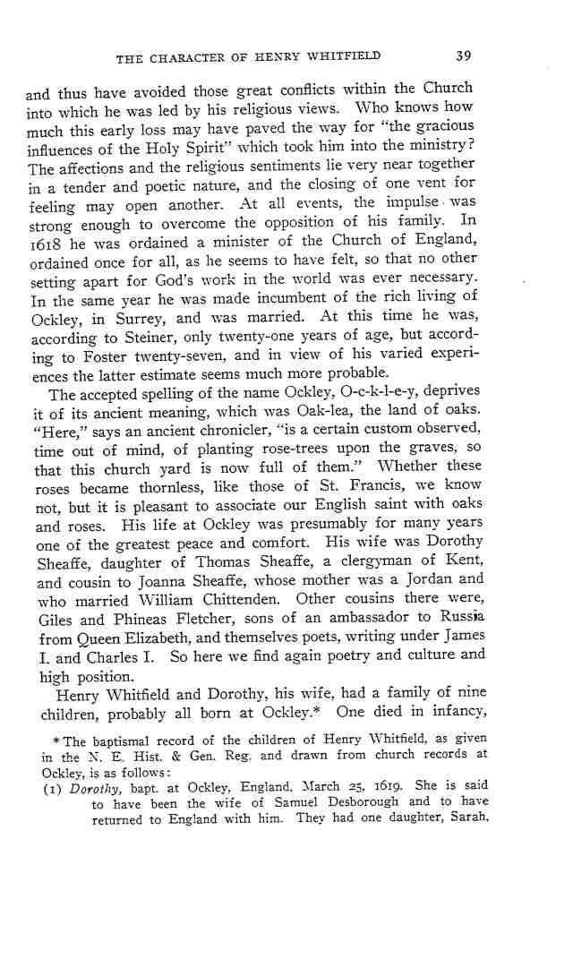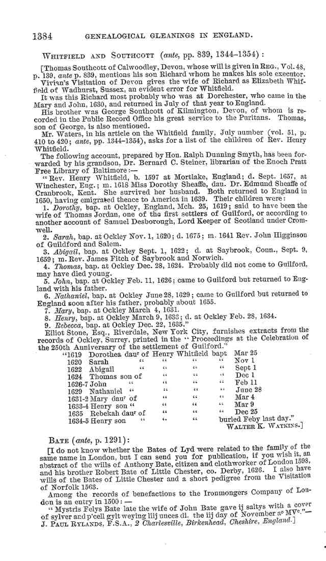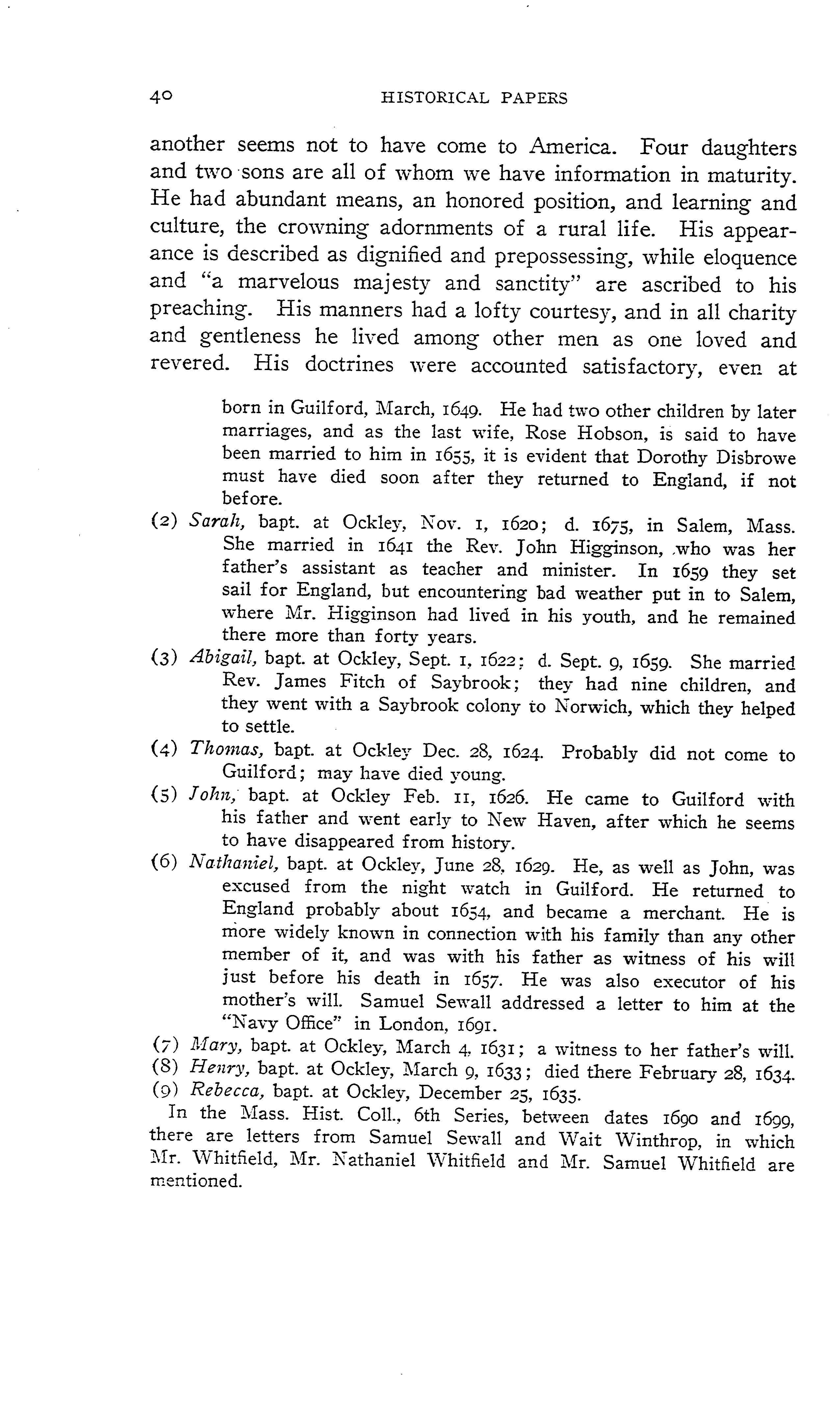 “WHITFIELD, …(5030) HENRY, Guilford, came to New Haven in July 1639, with Col. George Fenwick and his lady, and a child of famous John Davenport, who, in a letter of 27 Sept. aft. to lady Mary Vere, tells of the ship, that she was the first “that ever cast anchor in” that place. See Geneal. Reg. IX. 149 No Doubt he was bred up for the pulpit, but of his place of education wh. are unknown. The common account of him is, that he was son of a lawyer, b. about 1597, settled as minister at Ockham, about 20 miles. from London, in Co. Surry, but others day Ockley or Okely in that shire about three miles. from the metropolis