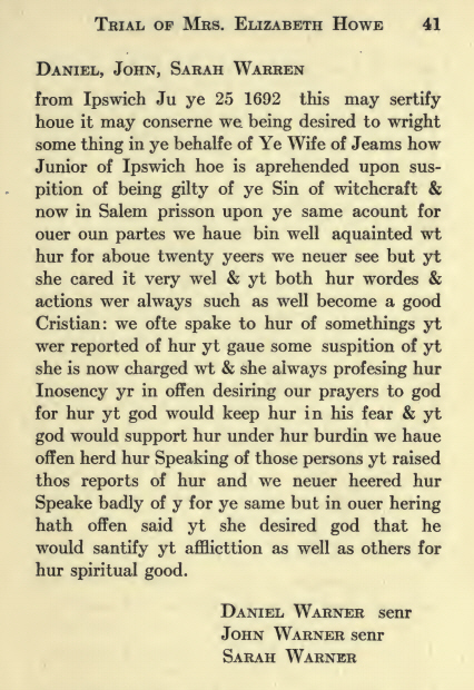 25 Jun 1692 –  John WARNER, his brother Daniel and Daniel’s wife Sarah wrote this petition in support of  their neighbor Elizabeth Howe.