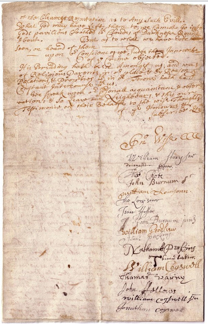 In her defense, Elizabeth Howe’s father-in-law testified to her good nature. He said that she, “[set] a side humain infurmitys as [become] a Christion with Respact to [himself] as a father very dutifully & a wifife to [his] son very carfull loveing obedient and kind Considering his want of eye sight.” He concluded his witness by saying, “now desiering god may guide your honours to se a difference between predigous and Consentes I rest yours to Sarve”