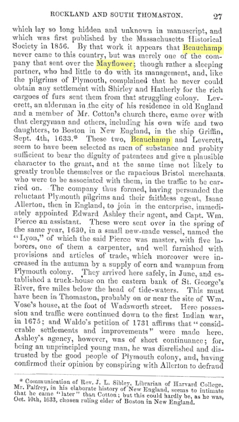 John Beauchamp (wiki) was an influential member of the company that financed the Mayflower. He was granted two large tracts of land in Massachusetts. He also patented tracts of land in Virginia and there is evidence that he traveled to Virginia.