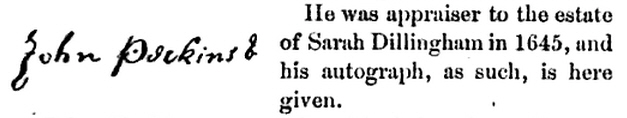 1645 – Our ancestor John PERKINS was appraiser to the estate of Sarah Dillingham.