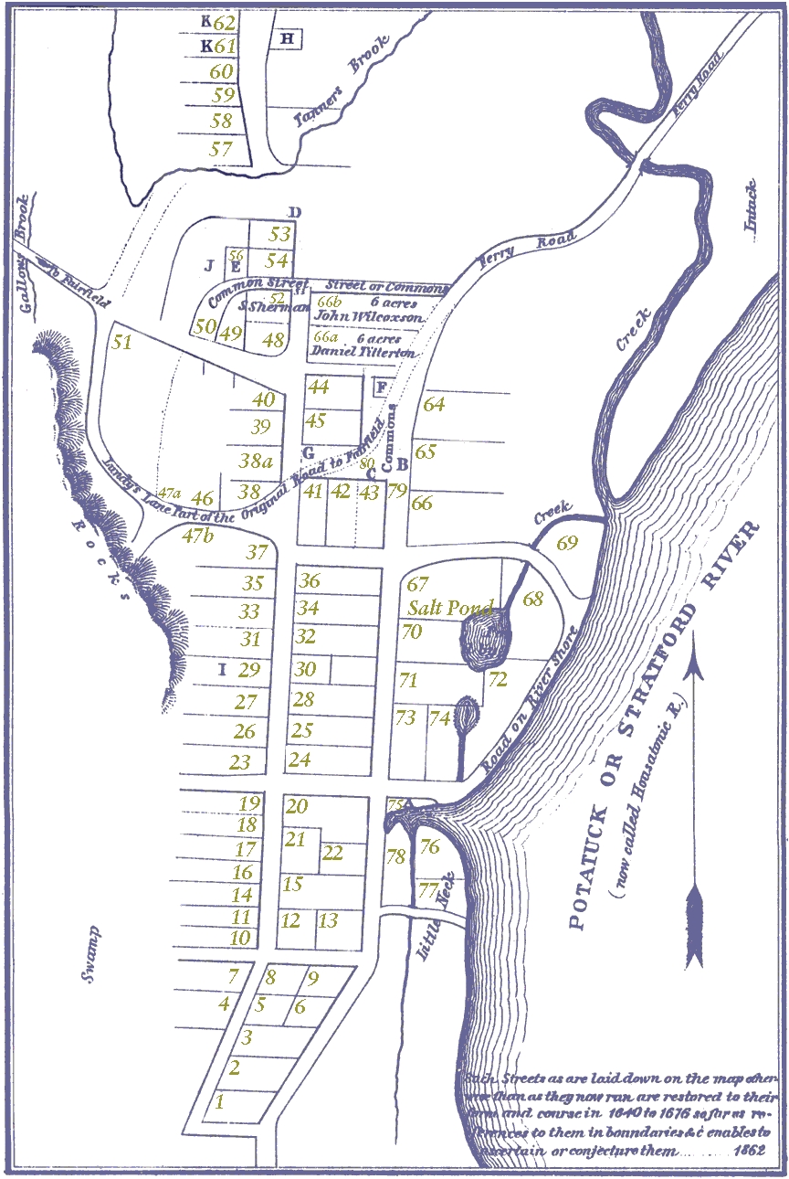 The first settlement was made at a place now known as Sandy Hollow, an arm of the Sound or creek, which penetrates a short distance from the Housatonic River, the ancient name of which was Potatuck. 3. Thomas (and then his son John) SHERWOOD 4. Elizabeth BEARDSLEY (widow of ?______ ) 5 and 8. Jeremiah JUDSON 6. John MINOR (Son of Thomas MINER) 7. William BENNETT 9. Nathaniel PORTER 10. David MITCHELL, ancestor of the late Prof. MITCHELL of North Carolina. 11. John HURD 12. Thomas SEABROOK, then 12th to John BIRDSEYE, Jr., 13. Thomas FAIRCHILD, Jr. 14. John PEACOCK, and then to his daughters, Miss Phebe BURGESS and Mrs. Deboarh (James) CLARKE. 15. Henry WAKELYN, now written WAKELEE. 16. Thomas UFFOOT. This property is still in the family. 17. Robert COE. Afterwards exchanged with UFFOOT for a place across the street, which UFFOOT had bought, and where the COES have ever since lived. 18. Samuel SHERMAN; then John PICKET. Mr. SHERMAN seems to have afterwards moved to the western part of Stratford (Pequonnock), and the PICKETS were among the first settlers of DURHAM. 19. Philip GROVES, the first and only ruling elder in Stratford Church. 20. Rev. Adam BLAKEMAN, first minister of Stratford. His descendants are written BLAKEMAN AND BLACKMAN. His only daughter, Mary, married Joshua ATWATER of New Haven and Rev. Thomas HIGGINSON, of Salem, Mass. 21. John BARLOW; then John HURD, then UFFOOT, then COE. 22. Mr. BRYAN bought James HARWOOD (original owner) and sold to Rev. Adam BLAKEMAN, who gae it to his son, Joseph B. Through J. HARWOOD, the BLAKEMANS became acquainted with Joshua SCOTTOW, merchant of Boston, whose daughter, Rebecca, Benjamin BLAKEMAN married. 23. Edward HIGBEE. 24. John JENNER; then John WELLS; then Widow Elizabeth CURTIS, who, with her two sons William and John, originated that name in Stratford. 25. Arthur BOSTWICK. 26. Jeremiah JUDSON. His gravestone yet stands in STRATFORD. 27. Joshua JUDSON (brother of Jeremiah; then John HURD. 28. Thomas FAIRCHILD. 29. Richard BOOTH, whose land extended beyond the lots north and ran northerly to the rocks. 30. Isaac NICHOLS, Sr., west side; Silles (?Stiles or Silas?) NICHOLS, and then Caleb, east side. 31. Adam HURD. 32. Francis NICHOLS; then Caleb NICHOLS. 33. Thomas QUENBY; then Joshua ATWATER; then Henry TOMLINSON. 34. William CURTIS; afterwards west end, Thomas CURTIS, who subsequently went, among the first settlers to Wallingford. 35. Adam HURD’s duplicate lot. 36. John BEACH, ancestor of the WALLINGFORD and STRATFORD name. 37. Joseph HAWLEY’S Original lot. 38. John THOMPSON. 38a. Francis JACOCKES. 39. William READ; then by exchange, Joseph HAWLEY. 40. William CROOKER. 41. Joseph JUDSON; in 1640 William JUDSON, the father. The original stone house stood about four rods from the northeast corner. 42. Rev. Zachariah WALKER’s half of parsonage lot. 43. Rev. Israel CHAUNCEY’s half parsonage lot. 44. Hugh GRIFFIN, then John WHEELER. 45. Richard HARVEY; then John BOSTWICK; then Congregational society for parsonages. 46. Francis HALL 47 and 47a. John BLAKEMAN 48. A strip of lowland, given to widow of Abraham KIMBERLY in 1680. 49. Daniel SHERMAN, son of Samuel, Sr., then Ebenezer SHERMAN. 50. Common or highway, now the west half of B. FAIRCHILD’s lot. It was originally the outlet of a short highway (coeval with the town settlement) that passed from Main Street round the low, wet land, now W. A. BOOTH’s lot and led into the old mill road through No. 60, as above said. Of this road the recent burial-ground lane is all that encroachments have left, from Main Street to the burial-place, through its width, resurveyed and confirmed in 1738, is above four rods. 51. Land of Isaac NICHOLS. 52. House-lot of Samuel SHERMAN, Jr. (now the Roswell JUDSON lot.) 53. The eastern section of the street, of which No. 50 was a portion. 54. John BEERS; then Samuel BEERS; then, after 1700, BURTON, PRINDLE, TOMLINSON, McEWEN. 55. Nathaniel FOOTE; then Benjamin LEWIS; then Congregational parish, for Mr. CUTLER; then Rev. Mr. GOLD. 56. Burial place. 57. Daniel TITTERTON, Jr. 58. Timothy WILLCOXSON 59. Jabez HARGER, who went to Derby at its settlement, 1670. 60. John HULL, ancestor of Commodore Isaac; went to Derby, 1670. 61. John PICKETT; went to Durham. 62. Robert LANE; above him was John COOKE, bounded north by Esek Lane or Street. 63. John YOUNG, who died April 1661, and his lot went to John ROSE; afterwards Robert WALKER. 64. Thomas Wells, above whom James BLAKEMAN owned eight acres. 65. John THOMPSON, who lived on No. 38. 66. John WELLS. 66 a. Daniel TITTERTON, Sr. 66 b. John WILLCOXSON, Sr. 67. John PEAT (sometimes spelled PEAKE). 68. Moses WHEELER; then, very soon, Richard HARVEY; then his sons-in-law. 69. Thomas CURTIS, from his father, John (now Chatfield and Gorham lots). 70. William WILLCOXSON, ancestor of all of that name in and of Stratford. 71. William BEARDSLEE, ancestor of all of that name in and of Stratford. 72. John BRINSMEADE. 73. Nicholas KNELL, whose wife was Gov. Francis NEWMAN’s daughter. 74. Robert RISE; then WHEELER; then Richard BENCH; then Rev. Israel CHAUNCEY. 75. First church edifice and burial-ground. 76. Originally UFFOOT’s, who in 1661 sold to Nicholas GRAY, if he maintain his dam wide enough for a passable cartway. 77. Granted in 1671 by town to N. GRAY, if he maintain his dam wide enough for a passable cartway. 78. Jehiel PRESTON, 1662. 79. Site of the second church edifice, from 1670 to 1743. WHITEFIELD preached in it, October 26, 1740. 80. Site of the third church edifice, from 1743 till burned by lightening in 1785. A. Site of the first church edifice and burying-ground. B. Site of the second church edifice, from 1670 to 1743. Whitefield preached in it October 26, 1740. C. Site of third church edifice, from 1743 till burned by lightening in 1785. D. Site of fourth church edifice, from 1786 to 1850. E. Burial-place, opened 1678. F. Site of first Episcopal church edifice in Connecticut, 1723, with its graveyard, which 