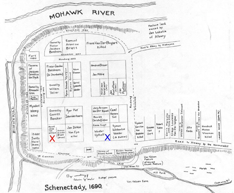 Schenectady Map 1690 showing the homes of many of colonists killed in the massacre -- Blue X marks the home of Elizabeth Hendrix and Wouter Albertse Van Den Uythoff. -- Red X marks the home of Barent Janse Van Ditmars, Catalyntje De Vos Bradt Van Ditmarsand Andries & Arentse Bradt