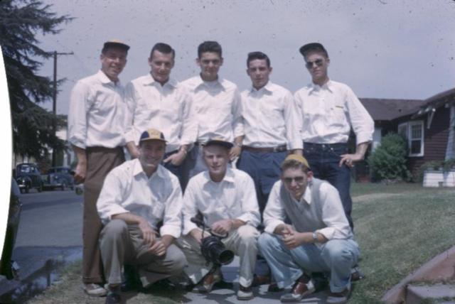 Theta Chi Brothers on the way to the football game, Everett front right — A frosh bennie it was, even though Everett was a Soph at the time. His Dad was wearing his Univ of Oregon beanie many many years later and shaved with it on.