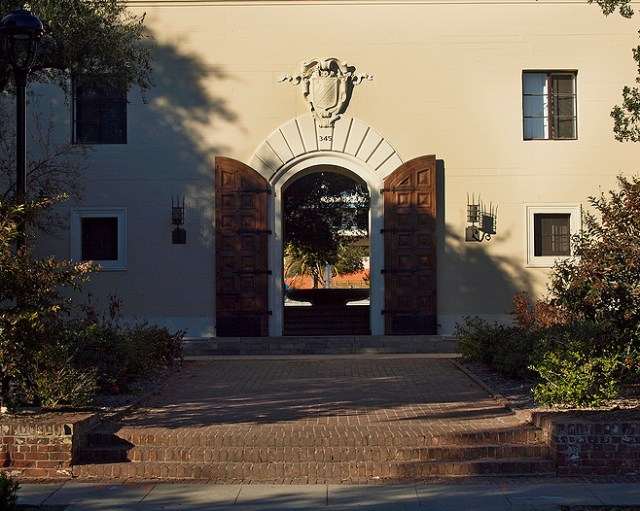 Pomona College Clark III – If you look carefully you will see the fountain just on the other side of the open doors. The Smith Clock Tower is in the Plaza beyond the open doors.. My senior year room is just to the right of this frame