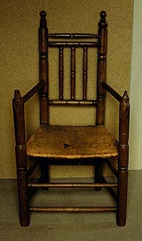 The name of Plymouth’s first governor, however, has been firmly attached to this type of Early American chair; chairs with turned spindles in the back only are known generically today as “Carver chairs.” They differ from Brewster Chairs, which have spindles under the seat and arms as well.