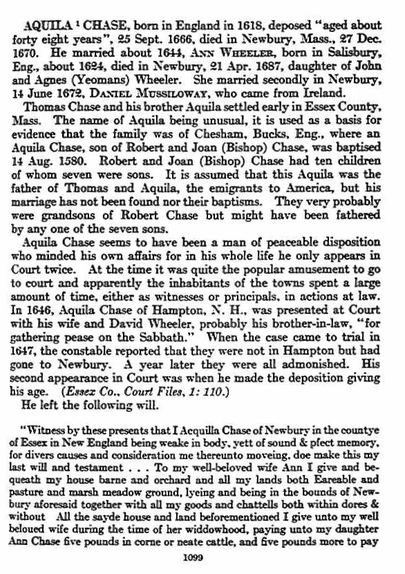 Aquila’s wife Ann Wheeler was born 20 Dec 1629 in Salisbury, Wiltshire, England. Her parents were John Wheeler and Agnes Yeoman. Ann died 21 Apr 1687 in Newbury, Essex, Mass.