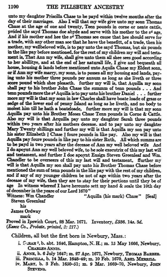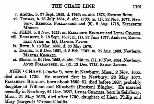 It hasn’t been proven that Aquila was the father of immigrants Aquila, Thomas and William Chase. Even if it their descent can’t be proven, I think it’s likely they were related. Perhaps the immigrants were Aquila’s nephews rather than sons.