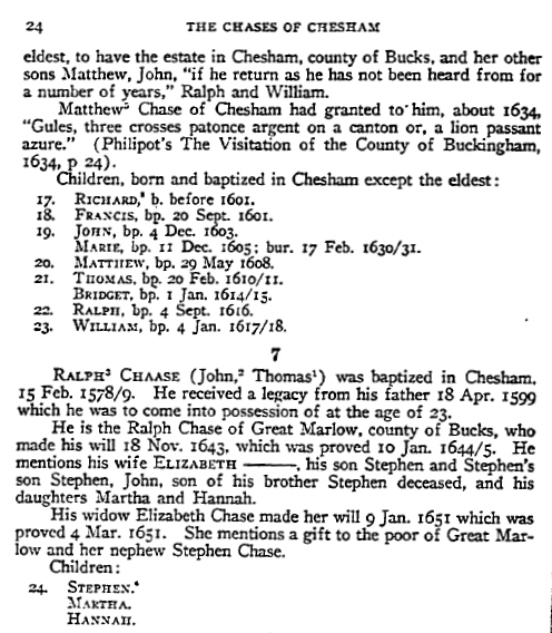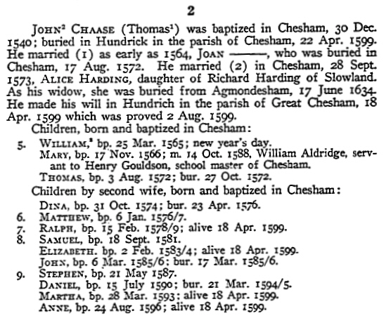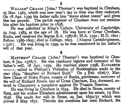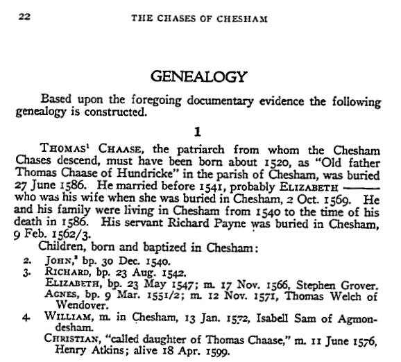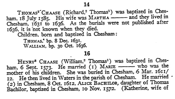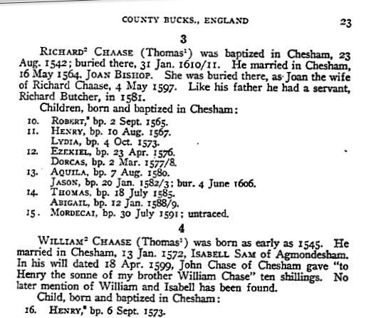| 6. | Aquila CHASE | 14 Aug 1580 in Hundrich, Chesham, Bucks, England | Martha (Sarah?) JELLIMAN 11 Jun 1606 in Chesham, Bucks., England. |