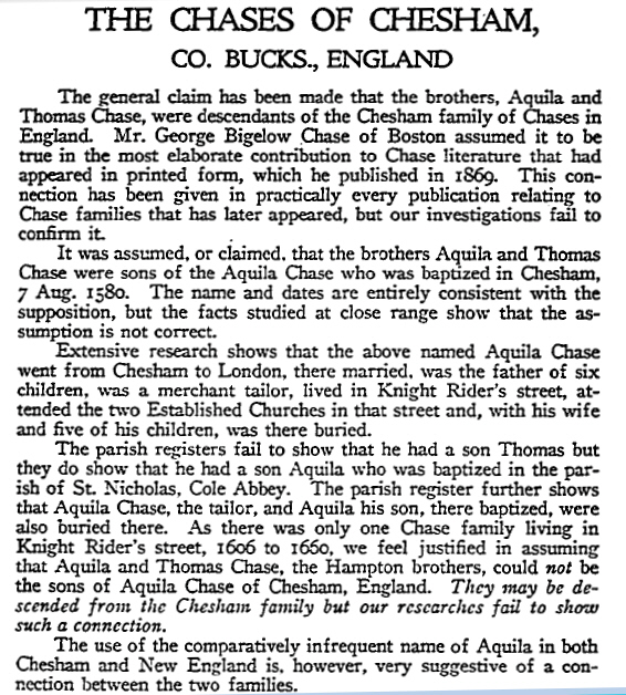 It hasn’t been proven that Aquila was the father of immigrants Aquila, Thomas and William Chase. Even if it their descent can’t be proven, I think it’s likely they were related. Perhaps the immigrants were Aquila’s nephews rather than sons.