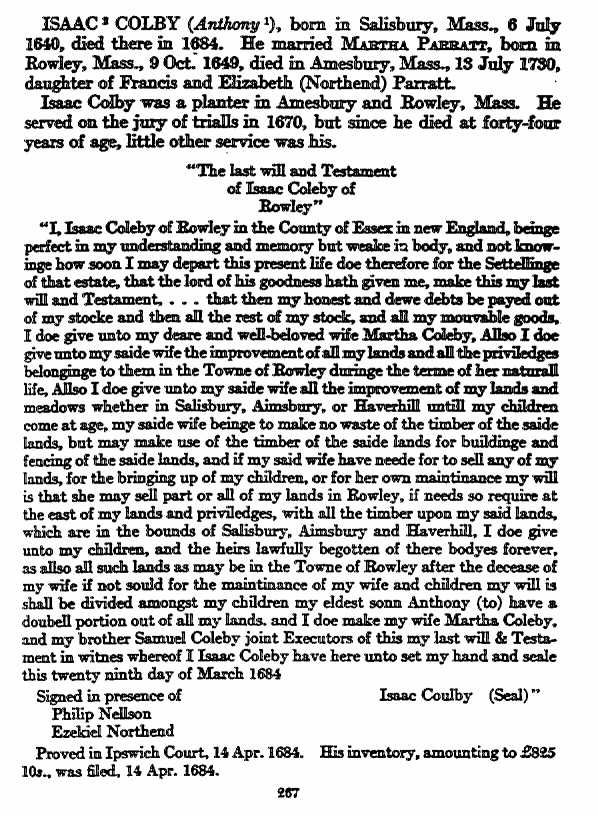 Isaac Colby was born 6 Jul 1640 in Salisbury, Essex, Mass. His parents were Anthony COLBY and Susanna [__?__]. He married Martha PARRATT in 1668 in Salisbury, Essex, Mass. Issac died 13 Jul 1723 in Amesbury, Essex, Mass.