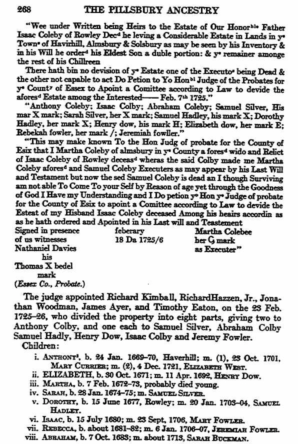 | 6. | Dorothy COLBY | 15 Jun 1677 in Amesbury, Essex, Mass | Samuel HADLEY Jr. 23 Jan 1702/03 in Amesbury, Mass |