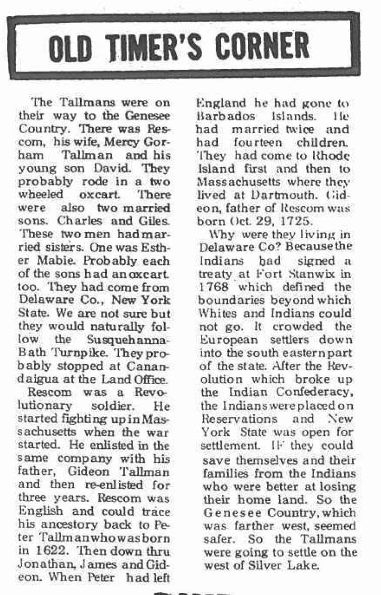1816 – Rescom, Mary and their grown children moved from Delhi to Wyoming County, New York and settled near Silver Lake. (220 miles west)