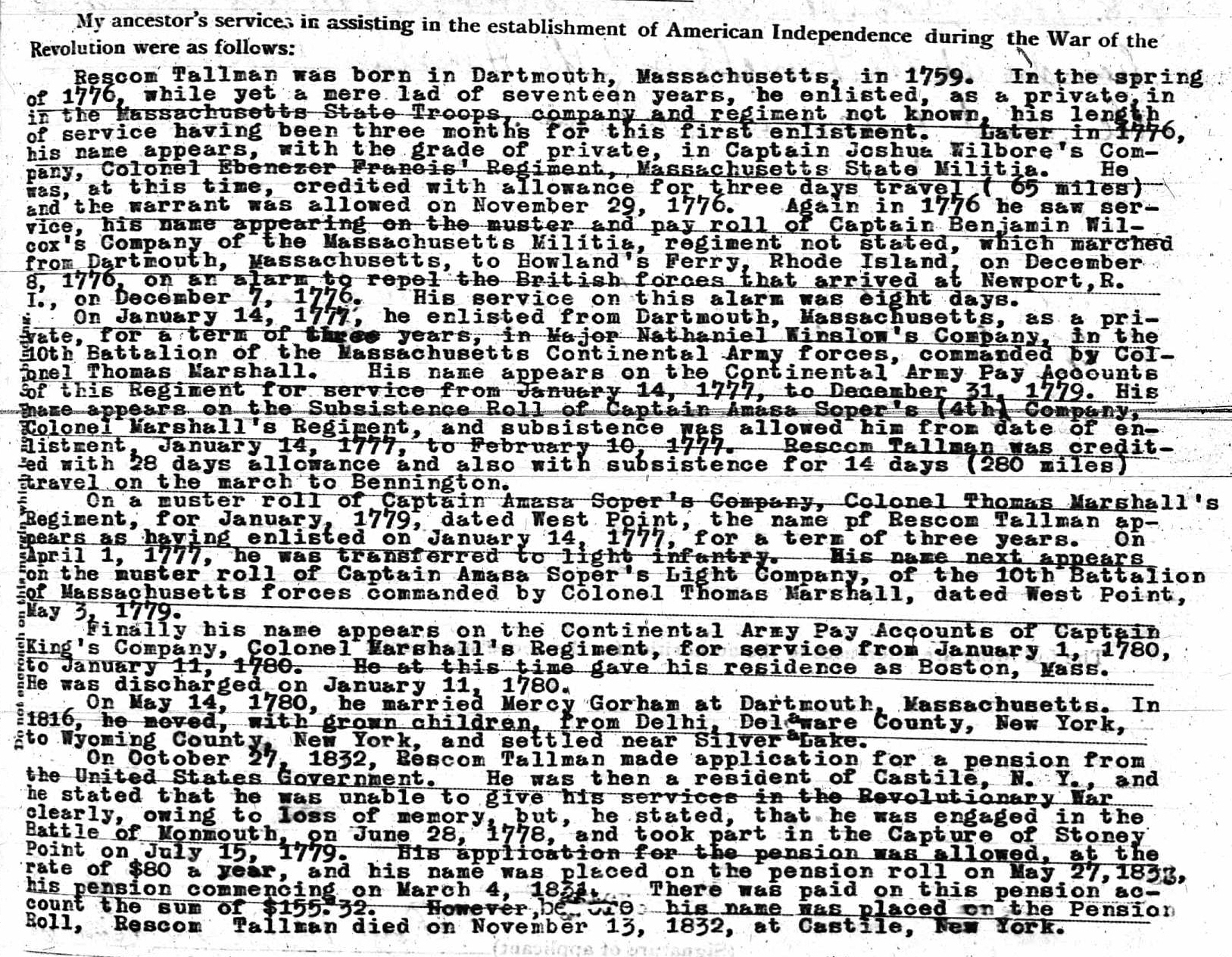 vii. Mary or Mercy Gorham b. 27 Mar 1771 in Yarmouth, Barnstable, Mass.; d. 16 May 1830 Delhi, Delaware, New York; m. 14 May 1780 in Dartsmouth, Bristol, Mass to Rescom Tallman (b. 7 Jan 1757 in Dartsmouth, Bristol, Mass. – d. 13 Nov 1832 in Castile, Wyoming, New York; Burial: Grace Cemetery, Castile). Rescom’s parents were Gideon Tallman (1725 – 1800) and [__?__]. Mary and Rescom had five children born between 1781 and 1793.