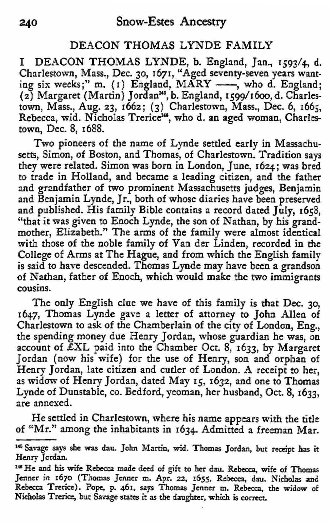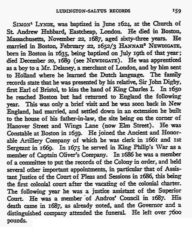 This is from a pedigree written from the knowledge of Chief Justice Benjamin Lynde, youngest son of Simon Lynde.