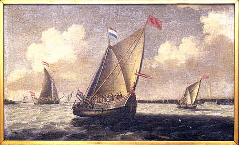 The ships shown in this seascape are the approximate size of the Pilgrims’ ill-fated ship, the Speedwell. — Ships in Harbor (Dutch seascape) By Abraham VerWer (1585-1650).