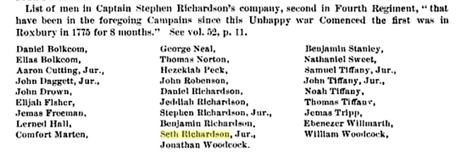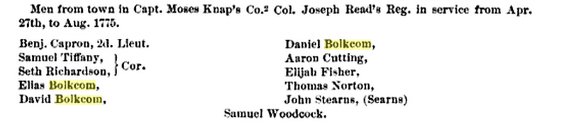 Elijah Bolkcom also served in Captain Stephen Richardson’s Company, second in Fourth Regiment in the “Second Campaign for Cambridge” and in what was called “The Six Week Campaign” in Roxbury, Masschusetts both in 1775.