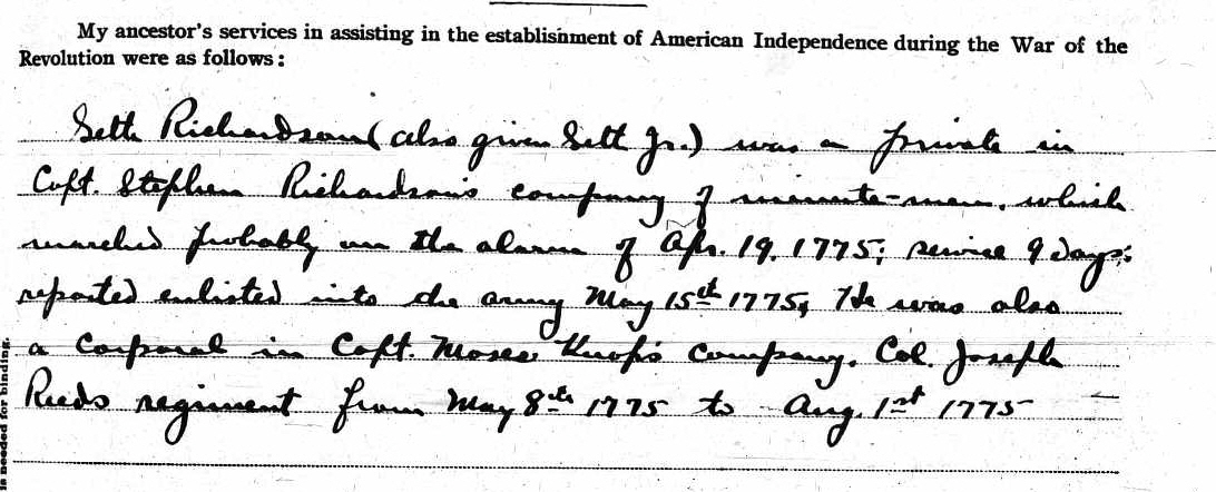 Richard was elected captain of the new company and his commission confirmed by the Continental Congress.  He left four young children to march to Lexington; enlisted 1776 in Col. Joshua Wingate’s regiment for Canadian service.  Next year he was elected captain of the Salem, NH company organized by his father Richard Dow Sr. and was attached to Col. Nathan Hale’s regiment.