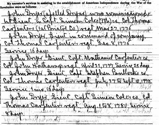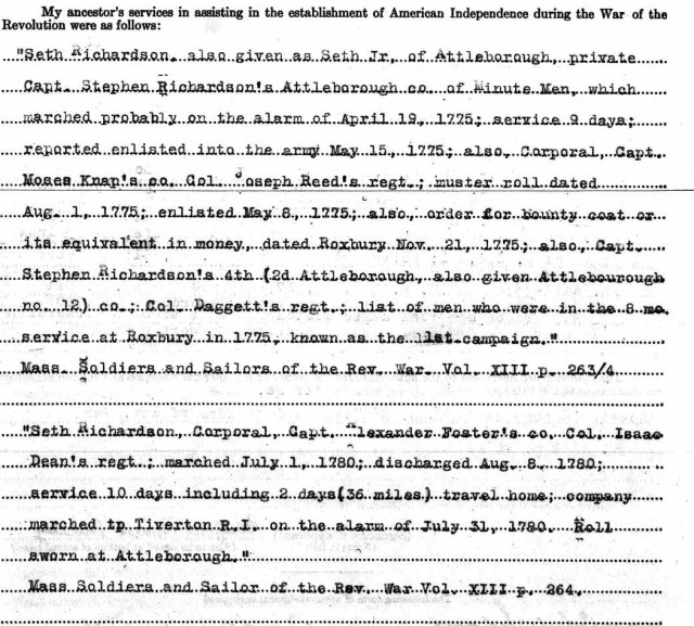 Served as a Private in Capt. Moses Wilmarth’s 9th company, Col. John Daggett’s 4th Bristol Regiment which marched on the alarm of April 19, 1775 served 9 days. Also on the alarm caused by the Battle of Bunker Hill (company order of the Town Treasurer of Attleboro July 5, 1775.