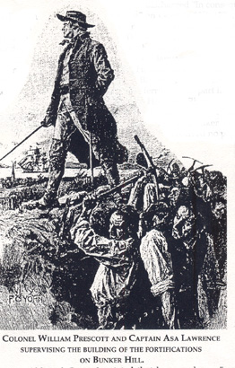 On June 16th, Colonel Prescott was ordered to take command of the regiments of Colonel Bridge and Frye, and with his men, proceed to Bunker Hill, under cover of darkness, and erect fortifications to preempt a possible breakout of the British by way of the Charlestown peninsula. Because Prescott’s men thought they would be relieved after the breastworks were completed, they took only their entrancing tools, a minimum supply of ammunition, and almost no food or water. They disobeyed their orders by marching past Bunker Hill to Breed’s Hill, where they worked quietly through the night without being detected. But, with the coming of daylight the surprised British opened a heavy barrage from Copp’s Hill in Boston and from four warships anchored in the Charles River, less then a mile away. Prescott’s men continued their digging in spite of this bombardment, suffering several casualties, including Lieutenant Joseph Spaulding of Asa Lawrence’s company, who was decapitated by a cannon ball as he stood next to Colonel William Prescott.