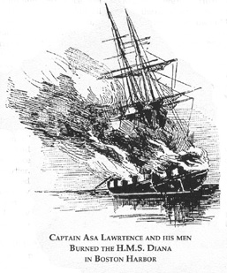 Wading through waist deep water, Captain Asa Lawrence led a boarding party which burned the H.M.S. Diana, but only after removing her twelve cannons and other supplies.