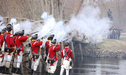 At the North Bridge in Concord, approximately 500 militiamen fought and defeated three companies of the King’s troops.  The outnumbered regulars fell back from the minutemen after a pitched battle in open territory.