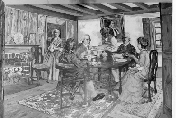 John Hancock and Samuel Adams being entertained at the Sewall house on April 19, 1775 —  Mural by Don Gorvette and Jeff Weaver in the foyer of the Burlington Historical Museum and was painted in 1973. The image shows left to right: Madam Abigail Jones, Rev. John Marrett, John Hancock, Cuff Trot, Samuel Adams, and Hancock’s fiance, Dorothy Quincy.