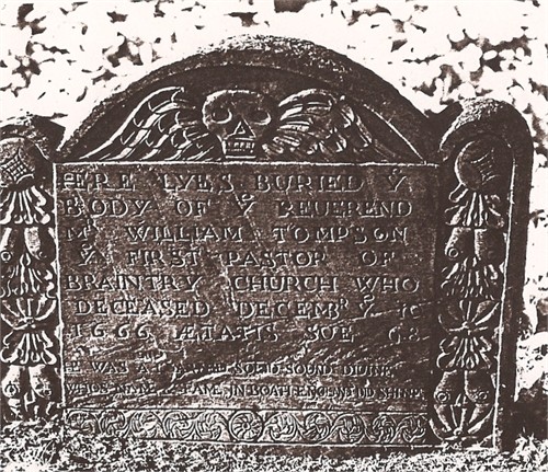 William Tompson matriculated at Brasenose College, Oxford University, England, 28 Jan 1619-20, aged 22, where he received the degree of B.A. 28 Feb 1621/22. He was curate at Winwick, but being persecuted for non-conformity he immigrate to New England in 1636. He was engaged first at Kittery or York, Maine, but after the church was institituted at Braintree 17 Sep 1639, was ordained there along with Rev. Henry Flint 19 Nov 1639