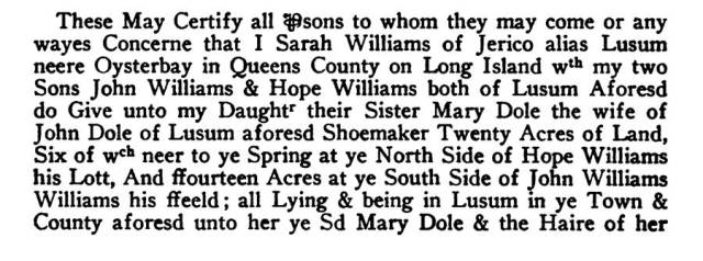 Sarah Washborne outlived her husband and, as the “widdow Williams” did a great deal of real estate business. Robert Williams’ land is so loosely described that the later generations require a great deal of arbitration to settle their boundaries. The most capable and prominent citizens from as far as Flushing and Huntington were called on to ride the bounds and settle the differences. It was one of their outstanding qualities that they chose this method instead of law suits, and there were many such “arbitrations” in a little haircloth trunk in the garret of the Ketcham house at Jericho where some trusted “squire” must have lived in each generation and had the neighborhood papers for safekeeping.