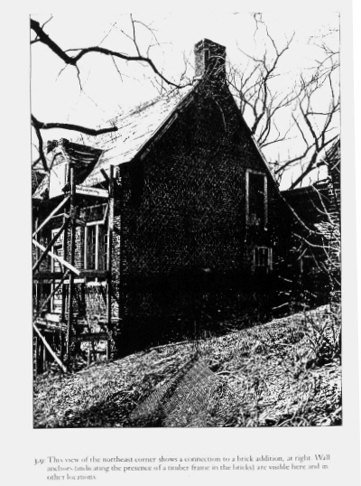 Van Wie Home- This view of the northeast corner shows a connection to a brick addition at right. Wall anchors indicating a timber frame in the bricks are visible here and in other locations.