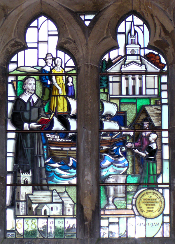 Ezekiel Rogers, St. Peter’s Church Rowley, England — The village of Rowley Yorkshire and town of Rowley Massachusetts enjoy close relations today. In 1994 the people of Rowley, Mass. gave to the church of St. Peter’s in Rowley Yorkshire. this stained glass window to honor the memory of their founder.