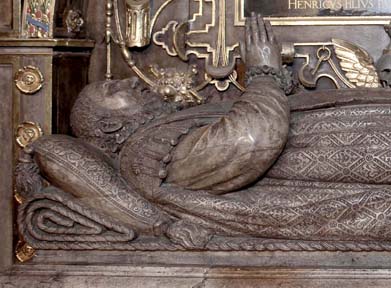 The former have a half-turn to the left: the latter, to the right. Both wear costumes almost exactly similar to those of their parents, except that the gowns of the sons lack fur trimming, while the costumes of the daughters lack both fur trimming and the ceinture, and their head-dresses, having no backs, allow their long hair to fall down their backs to far below the level of the waist.” The inscription (on a plate 17 by 2 1/2 inches) immediately below the principal figure reads: Translated: Here lies Thomas Fytche and Agnes his wife, which same Thomas died the twenty-first day of April, in the year of our Lord 1514; on whose souls may God have mercy.”