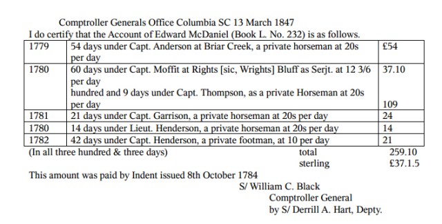 William McCAW Sr’s son-in-law Edward “Ned” McDaniel (1756-1824) served as private and horseman in Captain Thompson’s and Capt. Benjamin Garrison’s regiments Cols. Lacey, Bratton, and Gen. Marion. During the service, he was in several engagements, was wounded in the battle of Rocky Mount, and was wounded in the shoulder in the battle of Hanging Rock. He was pensioned by the State of South Carolina on account of wounds received in the War.”.
