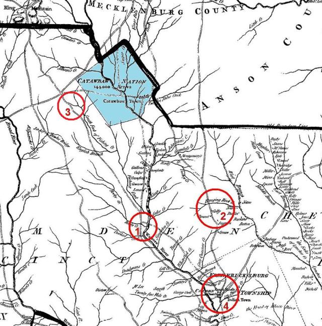 Rocky Mount Campaign Map , July, 1780 1) British post at Rocky Mount, 2) British post at Hanging Rock Creek, 3) site of the battle of Williamson’s Plantation, 4) British post at Camden. Shaded area is the Catawba Nation. The dark line at the top of the map is part of the border between North and South Carolina.