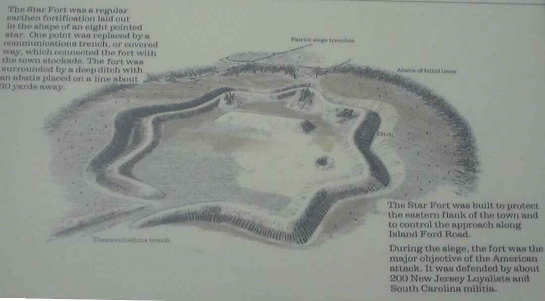 By June 3 Greene’s men had a trench within 30 yards of the Star Fort. They then used a tactic similar to one used by Gen. Marion to capture Fort Watson, whereby they constructed a wooden Maham Tower, about 30 feet tall, with a protected platform at the top. Under this elevated cover, American sharpshooters would have a clear firing line into the fort. At first, the crack Riflemen in the tower were able to pick off a number of Cruger’s artillerymen. Cruger quickly countered by using sandbags to raise the height of the parapet, giving enough cover so his own marksmen could fire on the tower through slats in between the bags. He also attempted to set the tower on fire with heated shot, but was unable to get the balls hot enough for this to be effective. The attackers then fired flaming arrows into the fort (a tactic that had worked when Fort Motte was captured), in order to set anything flammable within the fort on fire. Cruger had work crews remove the roofs off the buildings in the fort to prevent them from burning.