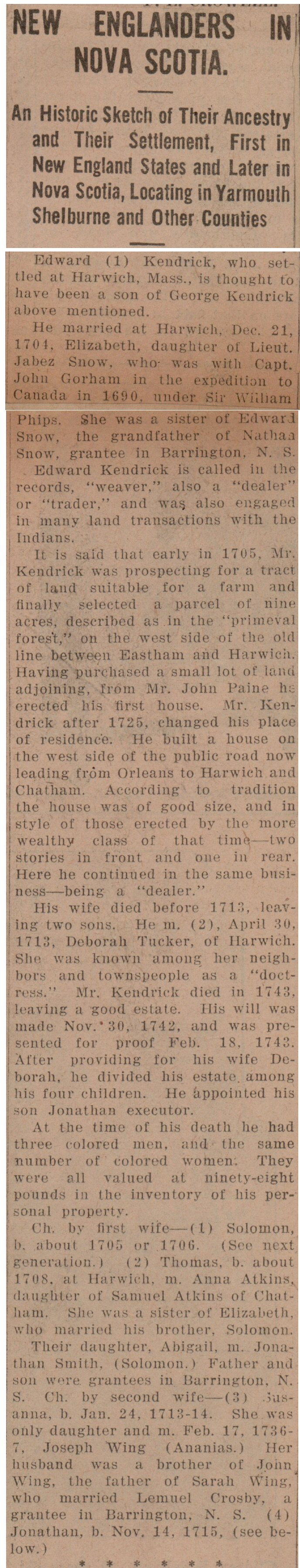 i. Solomon Kendrick b. 1706 in Harwich, Barnstable, Mass.; d. 1790 in Barrington, Shelburne, Nova Scotia, Canada; m. 1735 Chatham, Barnstable, Mass. to Elizabeth Atkins (b. 1715 in Chatham – d. 1790 in Sherose Island, Shelburne, Nova Scotia, Canada) Elizabeth’s sister Anna married Solomon’s brother Thomas. Their parents were Samuel Atkins (1679 – 1768) and Emeline “Emblem” Newcomb (1685 – 1768). Their grandparents were our ancestor Andrew NEWCOMB Jr. and his second wife Anna Bayes. She first married 31 Jan 1731 in Eastham to Daniel Eldredge (1702 – 1732). Solomon and Elizabeth had six children born between 1729 and 1751.