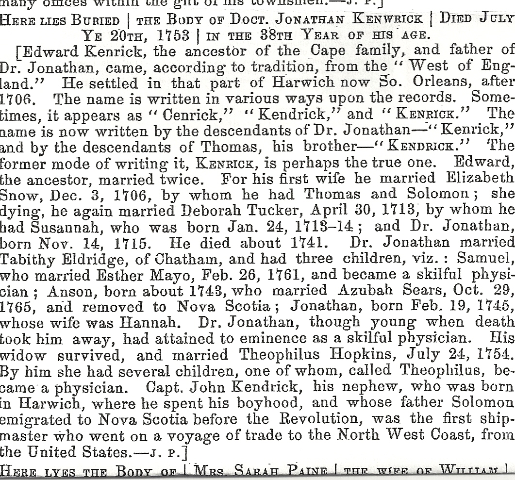 Elizabeth’s husband Edward Kendrick was born about 1680 in Yorkshire, England. His parents were Jonathan Kendrick (b. 1659) and [__?__]. After Elizabeth died 30 Feb 1713 Eastham. Edward married 30 Apr 1713 [he didn’t waste time!] to Deborah Tucker (~1682 – 1746) and had two children Susannah (b. 24 Jan 1713/14 in Harwich, Barnstable, Mass.) and Jonathan b. 1715 who became a doctor Edward died 1743 in Harwich, Barnstable, Mass.