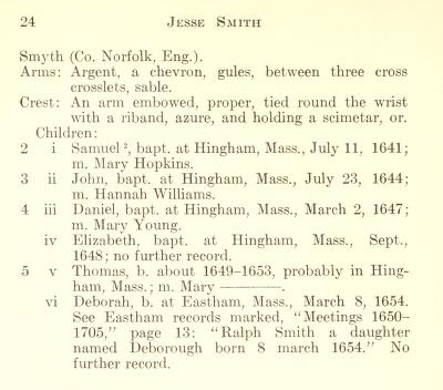 | 2. | Samuel Smith | bapt. 11 Jul 1641 Hingham, Plymouth, Mass | Mary Hopkins 23 Jan 1665 Eastham, Barnstable, Mass. |