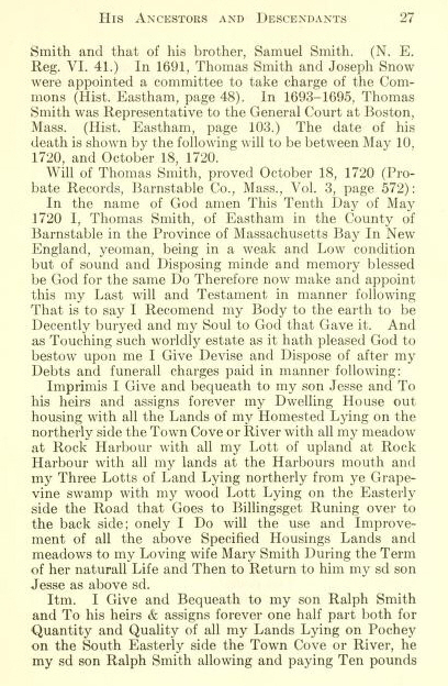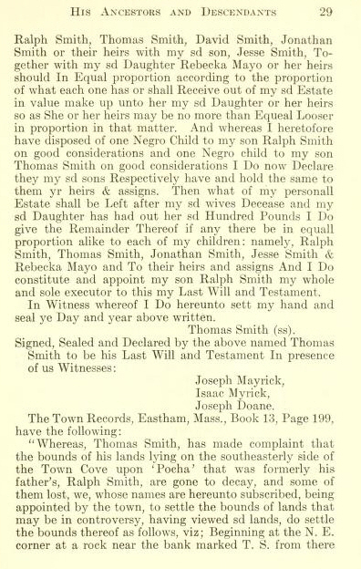 iii. Thomas Smith b: 29 Jan 1688 in Eastham, Plymouth Colony;d. 20 Sep 1745; m. 3 Nov 1709 to Joanna Mayo. He settled in Truro, Barnstable, Mass