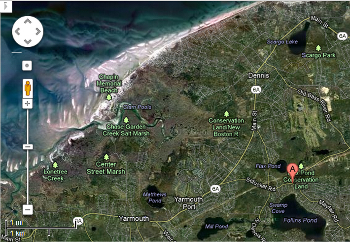 The actual location of Gabriel Whelden’s homestead was on the north bank of Follins Pond on the Bass River near the intersection of Setucket Road and Mayfair Road. It straddles the Dennis – Yarmouth line and the neighborhood is sometimes called “The Head of the Point.”