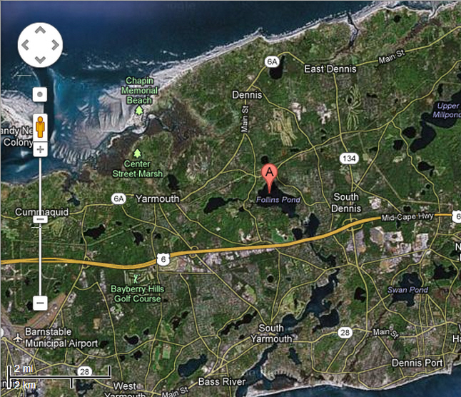 Follins Pond is named for Thomas Folland. It is a brackish lake on Cape Cod, separating the towns of Dennis and Yarmouth, Massachusetts. The lake is connected to Nantucket Sound via the Bass River.