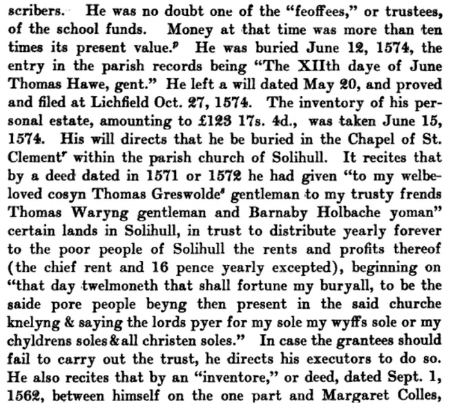 Thomas Hawes was born about 1500 Solihull, Warwickshire.  His parents were  Thomas HAWES (b. ~1450) and Ann GREANWOLD or Johanna RENSFORD.   He married Elizabeth BROME in 1527 in Lichfield, Staffordshire, England.  Thomas died 1574 in Solihull.