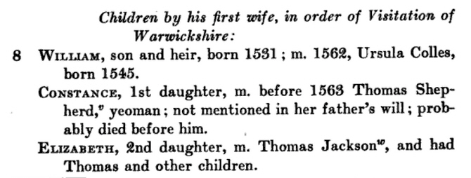 i. William Shepherd b. 1546 in Hockliffe, Bedfordshire, England’; d. 4 May 1623 Great Rollright, Oxfordshire, England; m. Ann Moore  (b. Whitechurch)  William and Anne had seven children