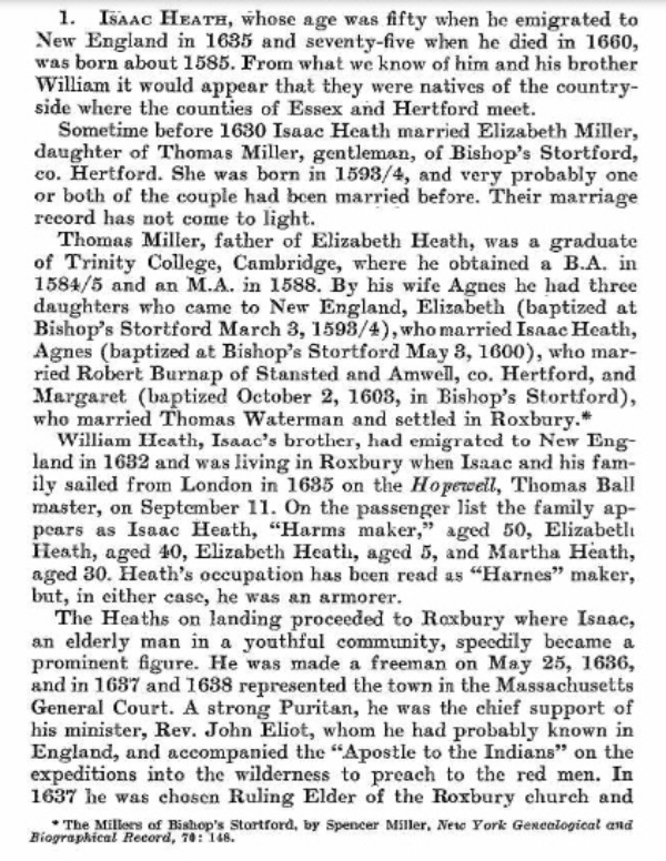BIBLIOGRAPHIC NOTE: For many years the best treatment in print of William Heath was that published by Walter Goodwin Davis in 1945 [Annis Spear Anc 29-34]. In 1978 Peter Walne found a few additional items, mostly relating to the marriages of William Heath [NEHGR 132:20-21]. In 1992 Douglas Richardson published an article which detailed the English origin of William Heath and his brother Isaac Heath, as well as others as noted above [NEHGR 146:261-78]; unless otherwise noted, the parish register entries above are from this article. In 1995 Richardson published an article supplementing that of 1992, solidifying the evidence that the immigrants William and Isaac Heath were sons of William of Ware, and identifying their mother [NEHGR 149:173-86].