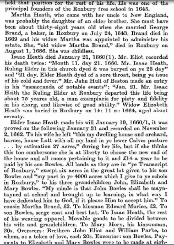 Upon landing the family proceeded to what is now Roxbury, Boston, Suffolk County, Massachusetts where brother William Heath was already settled. His house was west of the road that led from Boston to the Meeting House. Isaac was one of the chief men of the town.
