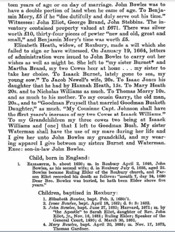 Besides John, Elizabeth, and Mary, children of John Bowles who married his only surviving child, Elizabeth Heath, and he gave the larger portion to his son-in-law John Bowles.