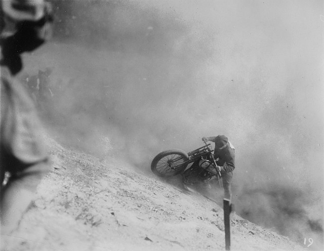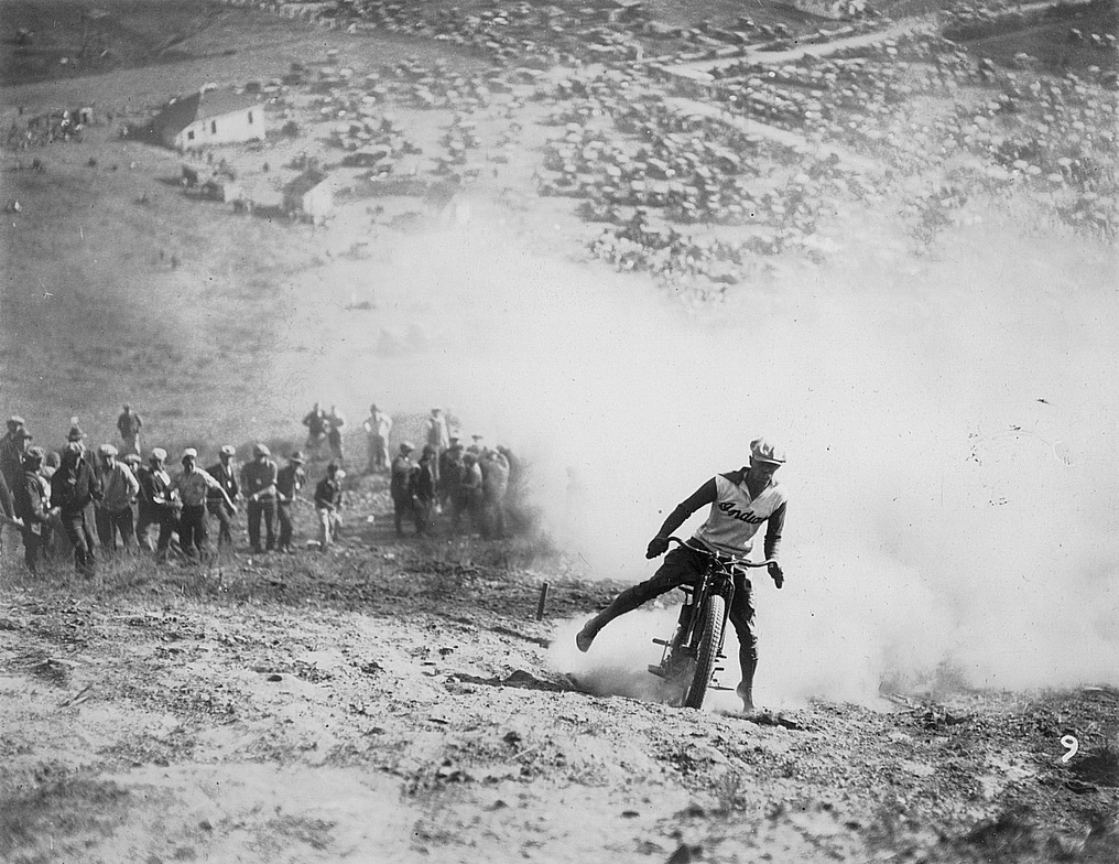 Going up this hill climb the motorcycles would bounce like a cork on a strong sea. The steepest part of the hill climb course had an average 74% grade with cuts and ruts one to two feet deep in places. The course was rough and steep. The record time for the 650-foot climb was 27-1/5 seconds from start to going over the top to the finish line.