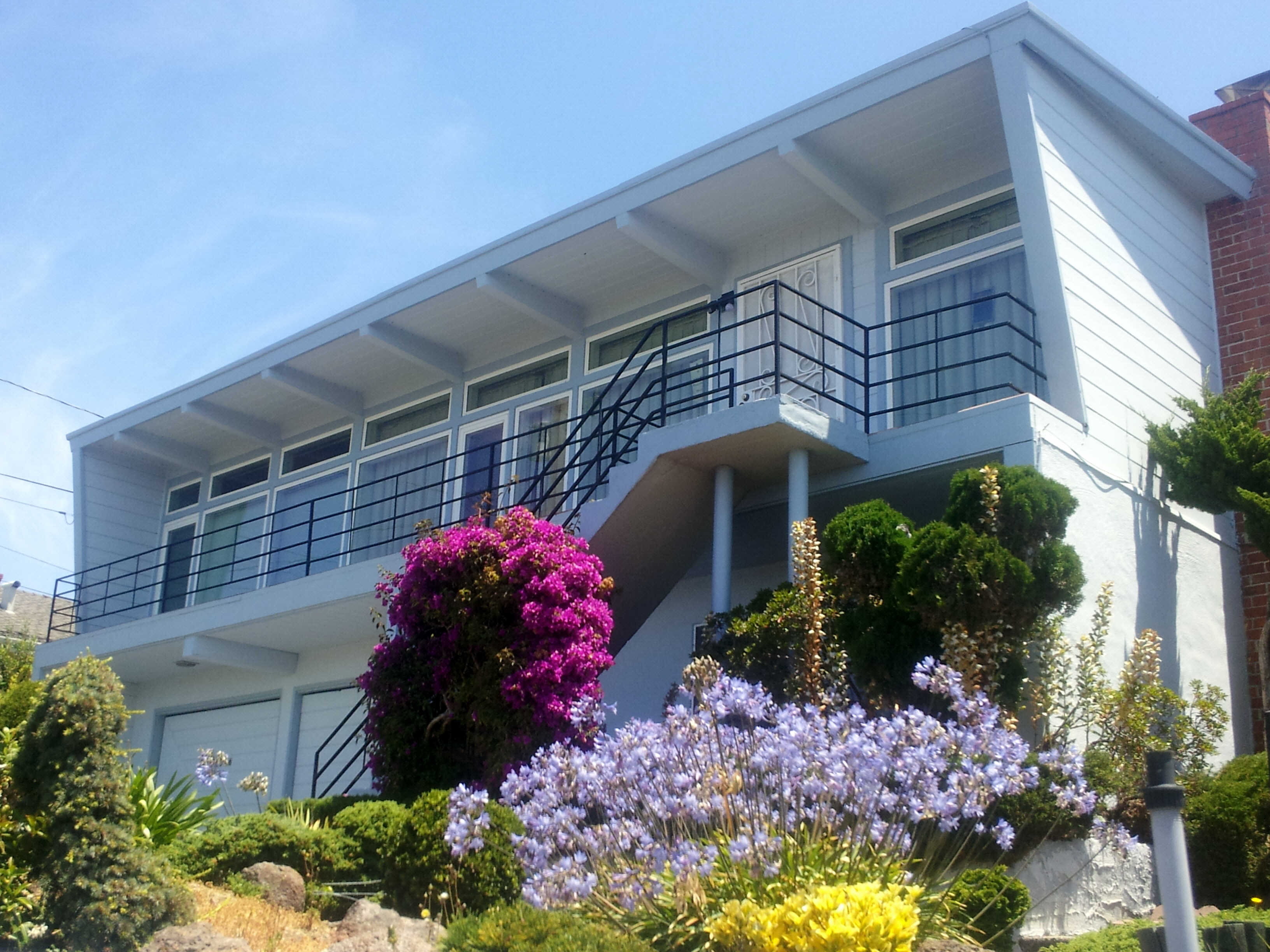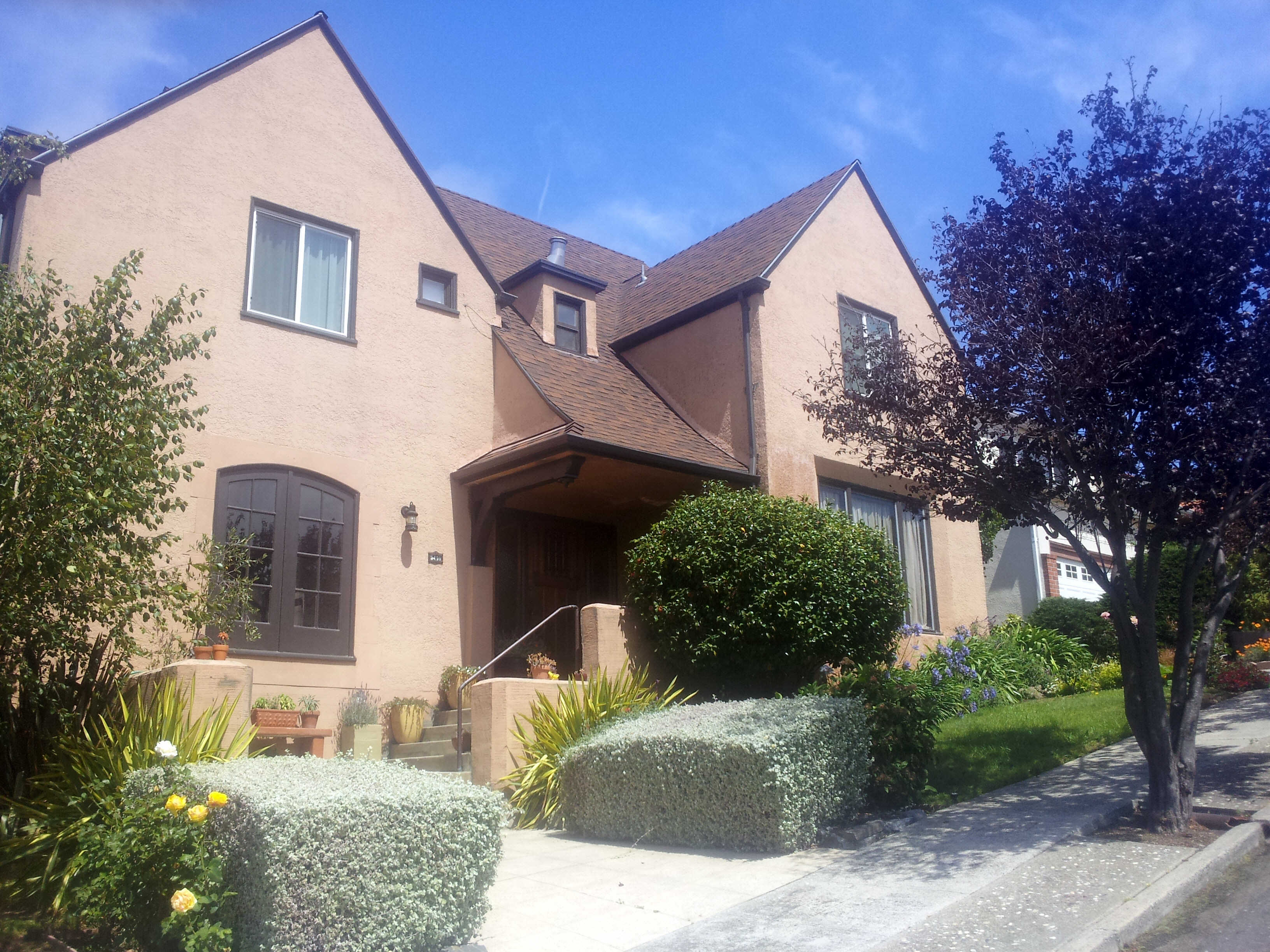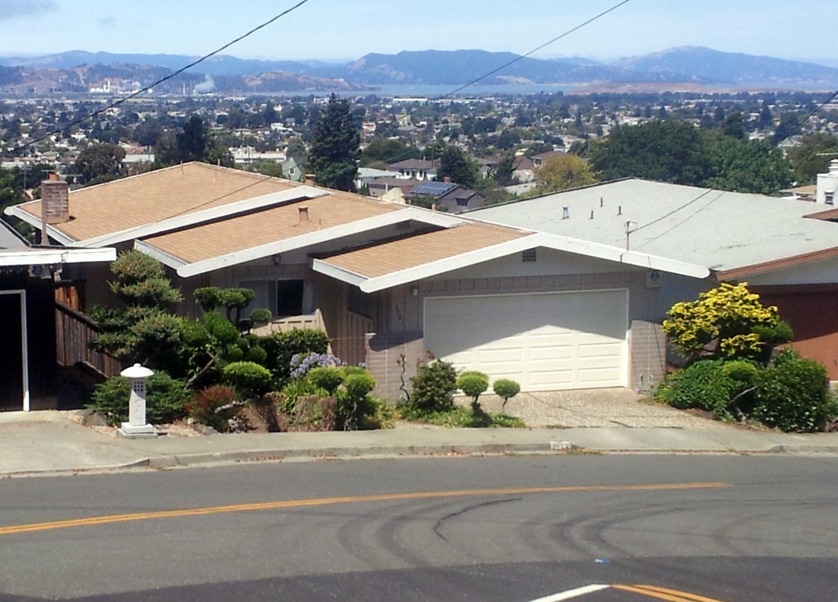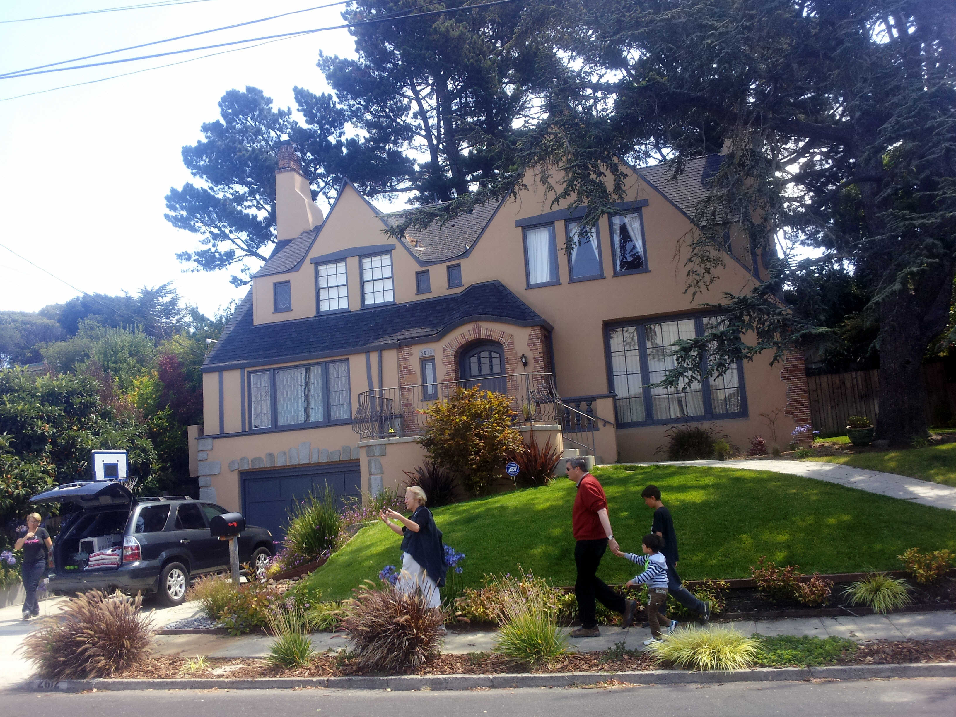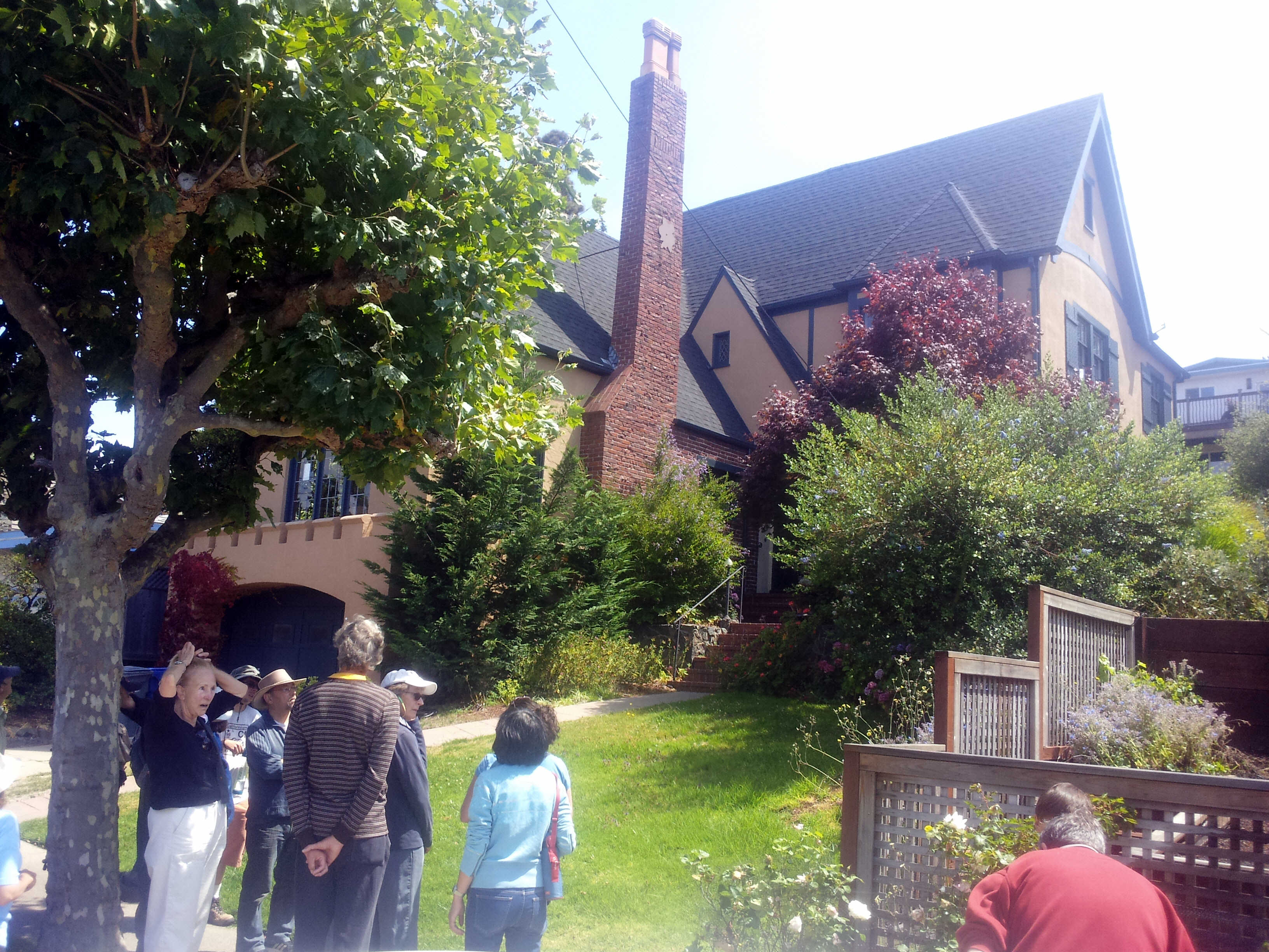 These pictures come from an El Cerrito Trail Trekker hike “Storybook Houses” led by Dave Weinstein on Saturday, July 19, 2014. This two hour tour of the northern border of El Cerrito took us past some of the most charming houses in town, Poinsett and Tassajara parks, hidden creeks and more. We saw some of the city’s loveliest Storybook, mid-century modern and ranch-style houses. We walked on the city’s public paths, saw beautiful gardens, stone walls showing a wide variety of styles and technique, and natural stone outcrops of blue schist and greywacke.